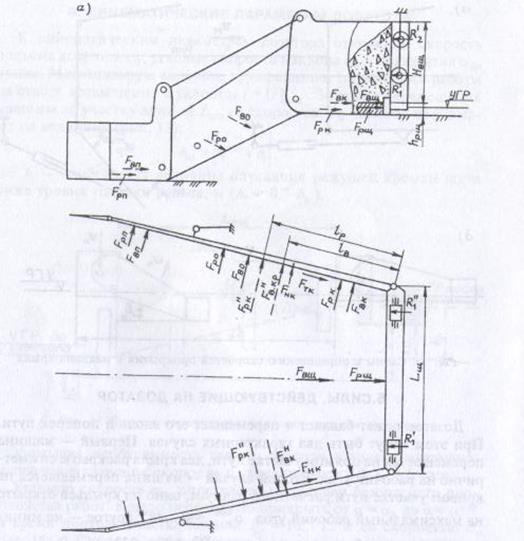 Для расчета силы все силы резания балласта и от призмы волочения, действующие на части крыла при работе, проектируют на горизонтальную плоскость и приводят к двум силам и . Составляют уравнение суммы моментов этих сил относительно шарнира, соединяющего щит и крыло, и определяют составляющую усилия , действующую в узле Е перпендикулярно плоскости крыла.