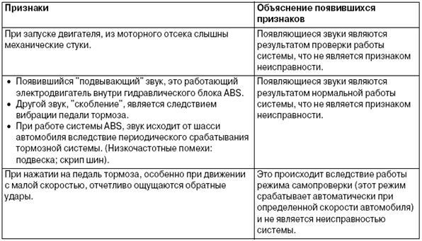 1. Система ABS является элементом тормозной системы, которая управляет давлением в гидроприводе тормозов электронным блоком (ECU). Соответственно, следующие признаки могут появляться время от времени, но они являются признаками нормальной работы системы ABS и не означают неисправности системы ABS.