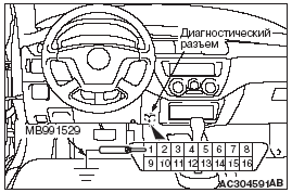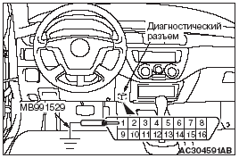 2. В этом случае рекомендуется использовать специальный инструмент - жгут проводов для проверки диагностических кодов (МВ991529) для соединения на "массу" клеммы 1 (клемма диагностического контроля) диагностического разъема.