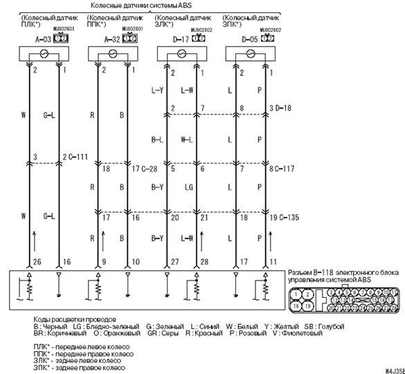Система 4ABS обеспечивает курсовую устойчивость автомобиля и его управляемость во время резкого торможения. Эта система ABS использует 3-х канальную систему с 4-я датчиками, которая независимо управляет правым и левым передними колесами, а также одновременно управляет задними колесами (выбор понижающего уровня управления - selectlow control*). В основном эта система та же, что и использовалась прежде в автомобилях COLT/LANCER.