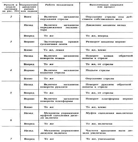 1 - стопором поворотної частини, 2 - опусканням стріли, 3 - механізмом пересування, 4 - механізмами повороту ковша і підйому стріли, 5 - механізмами повороту рукояті і повороту платформи, 6 - муфтою зчеплення, 7 - механізмом керування дизелем.