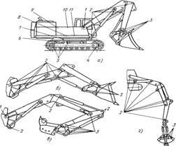 а — з устаткуванням прямої лопати, 6 — з навантажувальним устаткуванням, в — з устаткуванням зворотної лопати, г — з устаткуванням грейфера; / — шарніри стріли, 2 — шарніри кріплення гідроциліндрів, 3 — шарніри кріплення штока гідроциліндра ковша, рукоятей прямої й зворотної лопат, важеля й тяги ковша, 4, 5 — підшипники провідних і ведених коліс, опорних і підтримуючих котків гусеничного ходу, 6 — редуктор привода механізму пересування, 7 — ролики опорно-поворотного кола, 8 — нижній підшипник вихідного вала механізму повороту, 9 — редуктор привода механізму повороту, 10 — верхні підшипники вихідного вала механізму повороту, 11 — зубчастий вінець опорно-поворотного кола