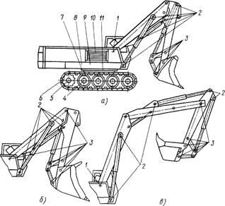 а - з устаткуванням прямої лопати, б - з навантажувальним устаткуванням, в - з подовженою зворотною лопатою; 1 - шарніри стріли, 2 - шарніри кріплення гідроциліндрів, 3 - шарніри кріплення штока гідроциліндра ковша, рукоятей прямої й зворотної лопат, важеля й тяги ковша, 4 - підшипники опорних і підтримуючих котків, 5 - підшипники валів ведучих коліс, 6 - редуктор привода механізму пересування, 7 - зубчастий вінець опорно-поворотного кола, 8 - нижній підшипник вихідного вала механізму повороту, 9 - редуктор привода механізму повороту, 10 - підшипник центрального колектора, 11 - ролики опорно-поворотного кола