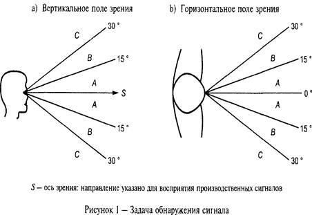 Для узнавания оптического сигнала при решении задач обнаружения и контроля обозначены три области пригодности в порядке убывающей эффективности: «рекомендуется», «пригодно», «непригодно». Линии раздела для областей «рекомендуется» и «пригодно» расположены в медиальной плоскости оператора и соответствуют направлению взгляда, как представлено на рисунках 1 и 2. При решении задач обнаружения направление взгляда зависит от центра внимательности. Для выполнения задач контроля индикаторы должны располагаться вдоль линии зрения ниже горизонтали, если известно, что это удобнее для оператора. Углы А, В и С, указанные на рисунках, дают общие рекомендации по эргономике. Предполагается, что оператор имеет нормальное зрение и может занимать напряженное и стабильное положение (предпочтительно сидячее) вблизи индикаторов.