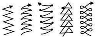 Необходимо прекратить все перемещения электрода и медленно удлинять дугу до обрыва; расплавляющийся при этом электродный металл заполнит кратер. При сварке низкоуглеродистой стали кратер иногда выводят в сторону от шва - на основной металл. При случайных обрывах дуги или при смене электродов дугу возбуждают на еще не расплавленном основном металле перед кратером и затем проплавляют металл в кратере. Рис. 2. Основные траектории движения конца электрода при ручной дуговой сварке уширенных валиков