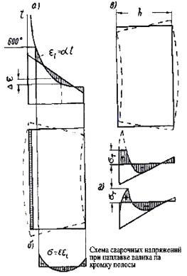 В процессе наложения шва остывающий металл производит на ранее наплавленную часть воздействия внецентренного сжатия, а сам подвергается стягиванию последующим наплавленным металлом ("Сварочные напряжения при сварке встык", эпюра на рис. Б). Свариваемые встык полосы изгибаются при сварке выпуклостью внутрь (рис. слева); при остывании полосы стремиться разогнуться и принять форму выпуклостью наружу, отчего возникают поперечные напряжения: растягивающие - в средней части шва и сжимающие - по краям ("Сварочные напряжения при сварке встык", рис. В).