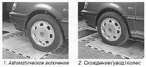 протектора, модели установленных на автомобиле шин и периодичности регулировок. Угол схождения при регулировке устанавливают в интервале 0±5', что обеспечиваеттакое же положение колес при движении автомобиля.