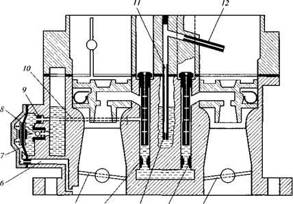 В корпусе карбюратора установлены также регулировочные винты 7 и 9 соответствен, но количества и качества горючей смеси при работе двигателя на холостом ходу. Отверстие под регулировочный винт 9 закрывается заглушкой. Для передачи разрежения от карбюратора к вакуумному регулятору распределителя зажигания в корпусе установлен патрубок 8, а для отсоса картерных газов служит патрубок 11.