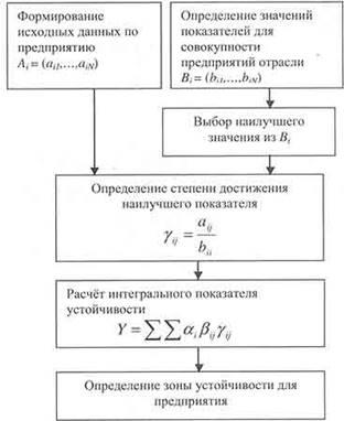Приведенная градация разработана на основе методики, изложенной в работе Стояновой Е. С. Как показывает практика, предложенные границы зон устойчивости являются достаточно стабильными. В этой связи важное значение имеет постоянный мониторинг интегрального показателя устойчивости, что позволяет сформулировать обоснованные выводы о траектории изменения рыночной позиции предприятия и об ослаблении или, наоборот, росте устойчивости. Блок-схема алгоритма определения интегрального показателя устойчивости приведена на рис. 3.2.