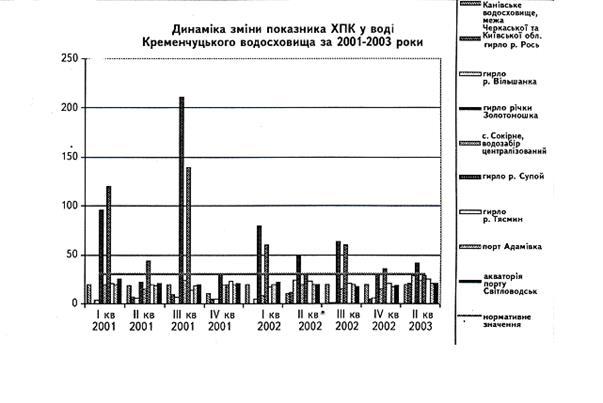 Рисунок 2.2 - Динаміка зміни показника ХПК у воді Кременчуцького водосховища за 2001-2003 роки.