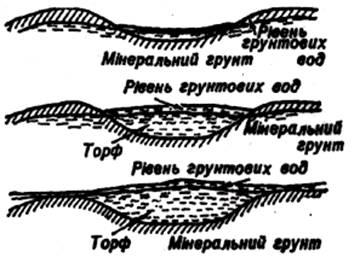 За характером водно-мінерального живлення, формою поверхні і складом рослинності торфові болота поділяються, у свою чергу, на три типи: низинні перехідні і верхові (рис. 1.2).