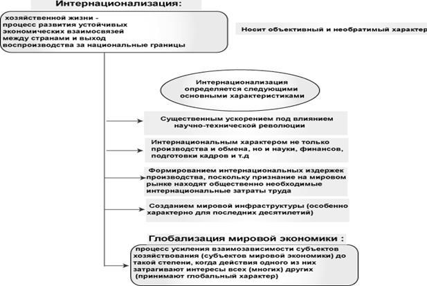 В результате международной кооперации производства, развития международного разделения труда, внешней торговли и международных экономических отношений в целом происходит усиление взаимосвязи и взаимозависимости национальных экономик, нормальное развитие которых невозможно без учета внешнего фактора. Данное явление принято называть интернационализацией хозяйственной жизни.