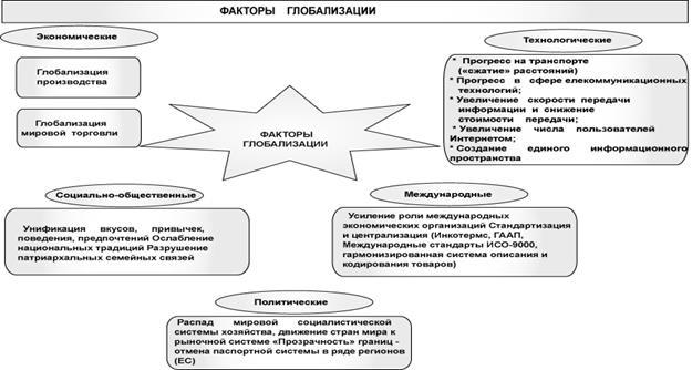 переход производства в международную форму (транснационализация) и ускоренное движение факторов производства и готовой продукции в рамках мирового экономического пространства;