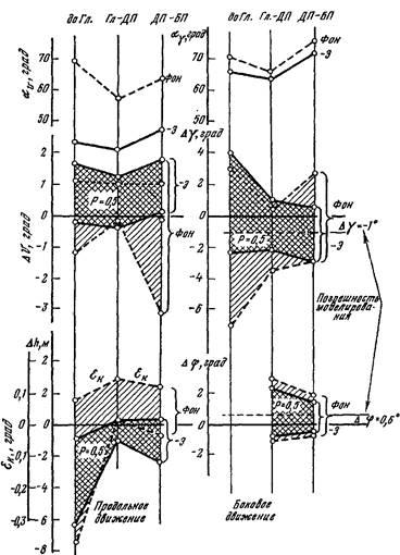 Изменение точности зрительной оценки крутизны склонов лунного рельефа находится в очень сложной зависимости от различных психических состояний и условий освещения и визирования. Средние данные, характеризующие эту зависимость, представлены на рис. 50. Наиболее общей закономерностью и здесь оказывается повышение точности работы при моделируемом эмоциональном напряжении. Субъективное переживание частичной весомости тела нередко сопровождается тенденцией к снижению точности визуальных метрических оценок.