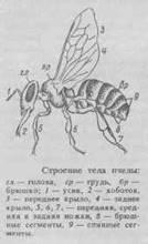 Строение тела пчелы. Тело каждой особи пчелиной семьи делится на три части — голову, грудь и брюшко. Опорой тела служит его наружный твердый покров — кутикула, напоминающая по своим функциям костный скелет позвоночных животных. К наружному покрову прикреплены ножки, крылья, усики, мускулы и внутренние органы насекомого.