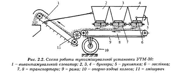 Змішані компоненти відвантажуються елеватором 1 в кузов розкидача. Продуктивність установки - ЗО т/год. Агрегатують її з тракторами класу 0,9 і 1,4, обслуговує оператор або тракторист.