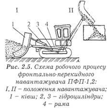 Фронтально-перекидний навантажувач ПФП-1,2 (рис. 2.5) обладнаний ковшем 1, підвішеним на П-подібній рамі 4. Для заповнення ківш опускають на землю і рухаються вперед (положення І), Потім його повертають гідроциліндром 2, піднімають гідроциліндром 3 (положення II) і вивантажують добрива в кузов транспортних засобів або розкидачів. Вантажопідйомність навантажувача - 1,5 т. Начіплюють його на трактор ДТ-75В. Продуктивність - до 125 т/год.