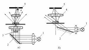 1 - осветитель; 2 - зеркало; 3 - затемняющая пластина; 4 - объектив;