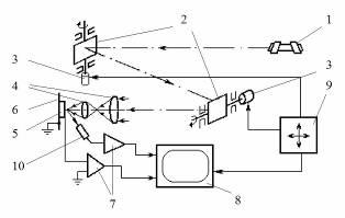 1 - ЭЛТ с бегущим пятном; 2 - полупрозрачное зеркало (светоделитель); 3 - окуляр микроскопа; 4 - объектив; 5 - зеркало; 6 - объект контроля; 7 - ФЭУ; 8 - электронная система; 9 - ВКУ; 10 - реперная координатная сетка (эталонная шкала); 11 - электронный блок с фотоприёмником, корректирующий абберации микрообъектива и нелинейность развёртки
