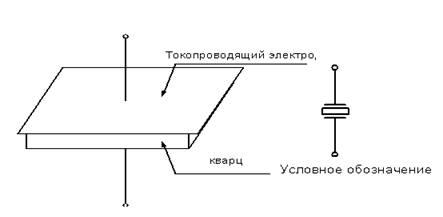 Наибольшее распространение в технике связи нашли кварцевые резонаторы, которые в простейшем случае представляют собой параллелепипед-пластину, вырезанную определённым образом относительно кристаллографических осей, с напылёнными на ней вакуумным способом электродами. Одна из конструкций резонатора и его условное схематическое изображение показаны на рисунке 1.