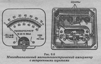 Обмотку рамки измерительного механизма рассчитывают на токи до 100 мА, если прибор используют как амперметр, и до 10 мА, если как вольтметр. Большие токи вызвали бы увеличение сечения проводов обмотки рамки (обычно диаметр проводов не превышает 0,2 мм), а следовательно, массы и момента инерции подвижной части прибора. Пределы измерения по току в магнитоэлектрических приборах расширяют с помощью шунтов, а по напряжению — с помощью добавочных резисторов.