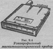 Широкое распространение получили узкопрофильные магнитоэлектрические приборы со световым указателем для установки их на щитах и пультах. Они занимают в 5... 10 раз меньшую площадь и имеют дополнительные информационные возможности за счет изменения при выходе измеряемой величины за устанавливаемые пределы цвета указателей или за счет появления сигнала от фотоконтактного устройства. Корпус прибора плоский, литой, высотой 80 мм.