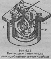 Электродинамические приборы имеют две катушки. Неподвижную катушку I выполняют из двух частей, между которыми проходит ось. На оси укреплена подвижная катушка 2. Противодействующий момент создается двумя пружинами (на рисунке не показаны).