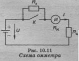 (рис. 10.11). При замкнутом ключе К регулируют напряжение U источника питания так, чтобы стрелку прибора установить на нулевую отметку шкалы прибора, которая находится в правом краю шкалы, при этом ток в приборе — I0