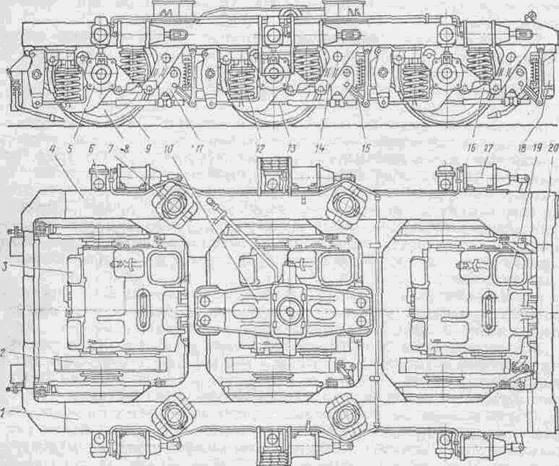1, 4- боковины; 2- кожух тяговой передачи; 3 - моторно-осевой подшипник; 5-узел буксовый; 6 - гаситель колебаний; 7 - устройство опорно-возвращающее; 8 - центр колесный; 9 - бандаж; 10- балка шкворневая; 11- подвеска; 12-комплект пружин; 13 - тяга; 14 - кронштейн; 15 - рычажная передача тормоза; 16 -поводок буксовый; 17 - цилиндр тормозной; 18 - кронштейн подвески тяговых электродвигателей; 19 - электродвигатель тяговый; 20 - крепление междурамное.