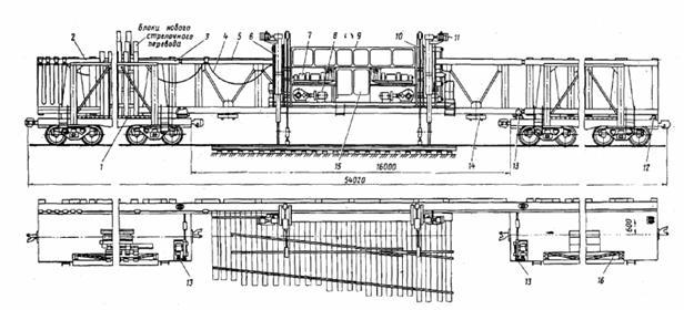 Вона робить навантаження зібраних на виробничій базі блоків, їх транспортування до місця робіт, зміну старопридатного стрілочного переводу, транспортування знятих блоків і вивантаження їх на базі. Машина (малюнок 1.3 з двох чотиривісних платформ 1 вантажопідйомністю по 60т, обладнаних фермами 2, що утворять підкранова колія для вантажної каретки 9. трикутними фермами 16, що служать стінками для обпирання на них блоків перекладу, допоміжних механізмів 13 для поперечного зсуву й обвідного блоку 12 для поздовжнього пересування пролітної ферми 5. За допомогою цих механізмів ферму приводять у робоче й транспортне положення. Для приведення в робочі положення платформи розчіплюють, локомотивом відсувають одну з них доти, поки кінець пролітної ферми збіжиться із шарнірними з'єднаннями ферми на іншій платформі. Потім механізмами 13 пролітну ферму зрушують і з'єднують із фермою платформи.