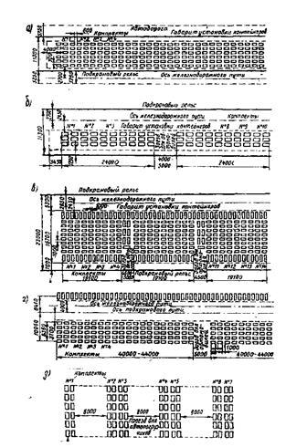 Типовые варианты грузовых и грузосортировочных ИНК с размещением контейнеров, обслуживаемых козловыми (консольными и бесконсольными), мостовыми, стреловыми кранами и автопогрузчиками представлены на рис 4.