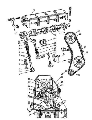 Рис. 9. Газораспределительный механизм с нижним расположением распределительного вала: