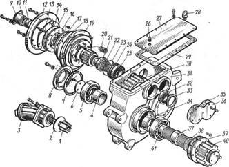 Основними деталями редуктора є вали-шестірні 3, 7, 11 і зубчасті колеса 4, 8, 14. Опорами валів-шестірень служать підшипники кочення 2, 5, 9, 25, 26, а опорами вала 18 - підшипники ковзання 15, 20. Ведуче колесо 19 приводу гусеничної стрічки жорстко закріплено на консольній частині вала 18. Олію заливають у корпус редуктора через верхні кришки, для контролю рівня олії маються два отвори, закриті пробками. Зливають олива через спускний отвір, також закрите пробкою.
