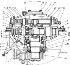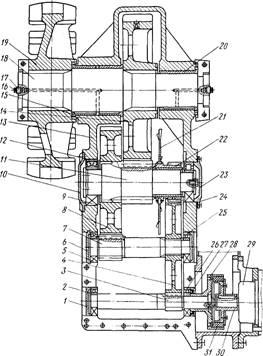 Від гідромотора 29 через напівмуфту 30 і гумові пальці 31 обертання передається напівмуфті 28, а далі ведучій валові-шестірні 3 редуктори.