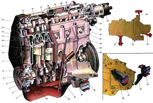 Двигатель (продольный разрез). 1. Коленчатый вал; 2. Крышка первого коренного подшипника; 3. Шкив привода распределительного вала; 4. Шкив привода генератора; 5. Передний сальник коленчатого вала; 6. Масляный насос; 7. Шатун; 8. Передняя защитная крышка зубчатого ремня; 9. Поршень; 10. Впускной клапан; 11. Выпускной клапан; 12. Ремень привода распределительного вала; 13. Шкив распределительного вала; 14. Задняя защитная крышка зубчатого ремня; 15. Сальник распределительного вала; 16. Передний корпус подшипников распределительного вала: 17. Распределительный вал; 18. Сетка маслоотделителя системы вентиляции картера; 19. Крышка головки цилиндров; 20. Крышка маслоотделителя; 21. Задний корпус подшипников распределительного вала; 22. Эксцентрик привода топливного насоса; 23. Датчик-распределитель зажигания; 24. Корпус вспомогательных агрегатов; 25. Отводящий патрубок рубашки охлаждения; 26. Свеча зажигания; 27. Головка цилиндров; 28. Блок цилиндров; 29. Держатель с задним сальником коленчатого вала; 30. Маховик; 31. Кронштейн с опорой передней подвески двигателя; 32. Силовой агрегат (двигатель с коробкой передач и сцеплением); 33. Кронштейн с опорой левой подвески двигателя; 34. Кронштейн с опорой задней подвески двигателя; 35. Опора передней подвески двигателя; 36. Кронштейн передней подвески двигателя; 37. Масляный картер; 38. Указатель уровня масла; 39. Пробка отверстия для слива масла из картера; 40. Кронштейн левой подвески двигателя; 41. Опора левой подвески двигателя; 42. Кронштейн задней подвески двигателя; 43. Опора задней подвески двигателя.
