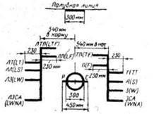 окружность диаметром 300 мм. Если грузовую марку наносят по Правилам Регистра, то по бокам круга наносят буквы «Р» и «С» высотой 115 мм и шириной 75 мм. На расстоянии 540 мм от центра круга (диска Плимсоля) в нос проводят вертикальную линию, а перпендикулярно ей —марки (горизонтальные линии длиной 230 мм, так называемую «гребенку»).
