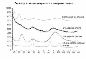 С помощью механоактивации получены образцы аморфных фуллеренов и изучена их структурная стабильность по отношению к температурным воздействиям. При высокотемпературном (600-1600К) отжиге аморфных фуллеренов обнаружен полиаморфный переход из молекулярного стекла в атомарное, сопровождающийся исчезновением фуллеренных гало при малых углах рассеяния (рис.3).