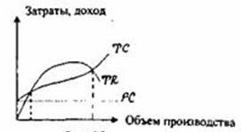 Поведение кривой совокупного дохода (TR) объясняется тем, что на определенном этапе происходит насыщение рынка продукцией, и предприятие вынуждено снижать цену для того, чтобы не потерять свою долю рынка. Когда кривая совокупного дохода начинает ниспадать, это означает, что отрицательный эффект от снижения цены превысил эффект от увеличения масштаба. Таким образом, получается две точки безубыточности (А и В), но предварительно рассчитать их величины практически невозможно.