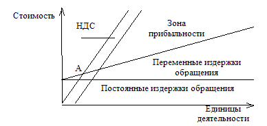 Таким образом, точка безубыточности торговой сделки равна сумме покупной стоимости партии товара и постоянных издержек обращения за вычетом налога на добавленную стоимость, уменьшенной на величину переменных издержек обращения и НДС торговли.