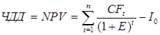 где Е – желаемая норма прибыльности (ставка дисконтирования); I0 – первоначальное вложение средств (инвестиционные затраты), CFt – чистый денежный поток в конце периода t.