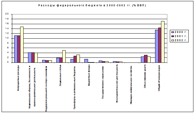 Общие расходы бюджета в первом полугодии 2002 г. составили 17,2% ВВП, что несколько выше (на 2,8% процентных пункта), чем в соответствующий период 2001 г. Сокращение платежей по обслуживанию долга означает, что доля непроцентных расходов бюджета увеличилась больше, чем общая величина расходов в первом полугодии 2002 г. Непроцентные расходы в первом полугодии 2002 г. составили 14,8% ВВП, что на 3,6% процентных пункта выше, чем годом ранее. Значительно выросли расходы по социальным статьям (на 3,0% процентных пункта ВВП), также увеличились расходы на реальную экономику (на 0,1% процентных пункта ВВП).