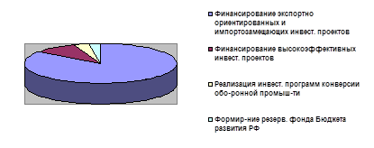 Средства Бюджета развития РФ на 2000 год в объеме 26 884,8 млн. рублей были направлены в большей степени на финансирование экспортно-ориентированных и импортозамещающих инвестиционных проектов (85,4 %), а также финансирование высокоэффективных инвестиционных проектов (8,8 %). На реализацию инвестиционных программ конверсии оборонной промышленности было выделено 3,4 % средств Бюджета развития. Оставшаяся часть (2,4 %) расходовалась на формирование резервного фонда Бюджета развития РФ под ранее предоставленные государственные гарантии.