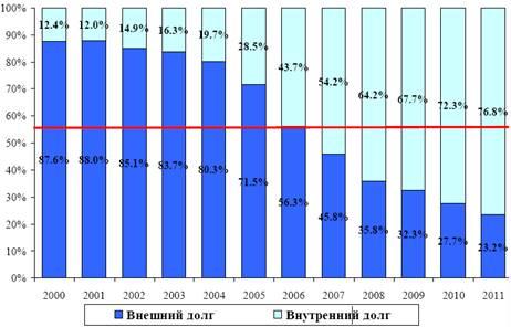В результате проводимой долговой политики совокупный объем государственного долга Российской Федерации составит 7,98% ВВП на конец 2011 года, при этом к концу 2011 года доля внутреннего долга в совокупном объеме госдолга достигнет 76,8 % при соответствующем снижении доли внешнего долга (рис.8).