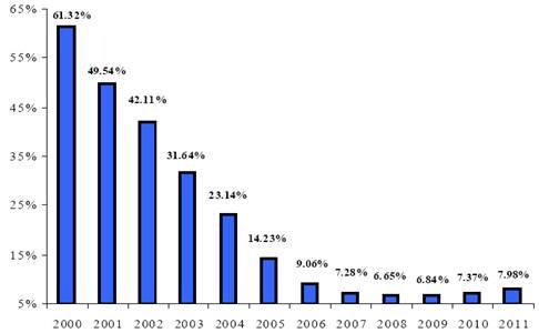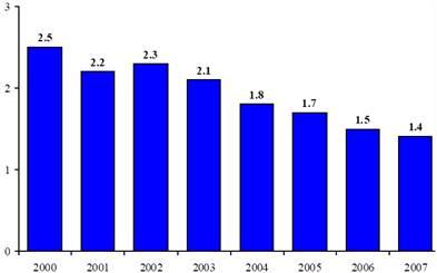 Долг субъектов Российской Федерации как доля ВВП сократился с 2,5% в 2000 году до 1,4% в 2007 году . (рис. 10)
