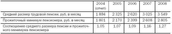 Доля расходов федерального бюджета на выплату пенсий (включая перечисления Пенсионному фонду) в 2006 году составит 24%. Эти средства позволят к 2008 году увеличить средний размер трудовой пенсии в 1,9 раза, довести размер социальной пенсии до прожиточного минимума пенсионера, увеличив ее в 2 раза, повысить пенсии военнослужащим в 1,6 раза. В результате будет заметно повышен уровень жизни пенсионеров(таблица 2).