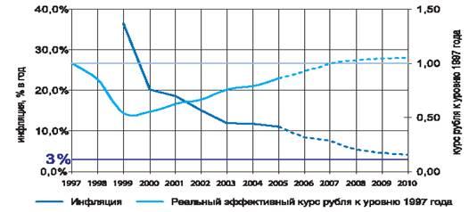 В то же время в среднесрочной перспективе следует сдерживать рост бюджетных расходов, сохраняя его на уровне, не превышающем 16,5–17% ВВП. Только такая, взвешенная и ответственная, бюджетная политика в сочетании с ограничением темпов роста контролируемых государством тарифов на газ, электроэнергию, железно-дорожные перевозки, жилищно-коммунальные услуги в пределах 5–8% в год позволит к 2008 году снизить уровень инфляции до 4–5,5%, а в перспективе — до 3% при сохранении стабильности и предсказуемости курса рубля (рис. 9).