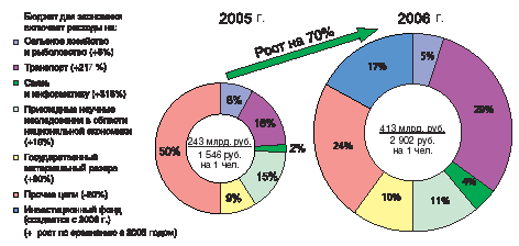 Общий объем непроцентных (не связанных с обслуживанием долга) расходов федерального бюджета в реальном выражении (с учетом инфляции) в 2006 году по сравнению с 2005 годом увеличится на 15%, а к 2008 году — на 27%.