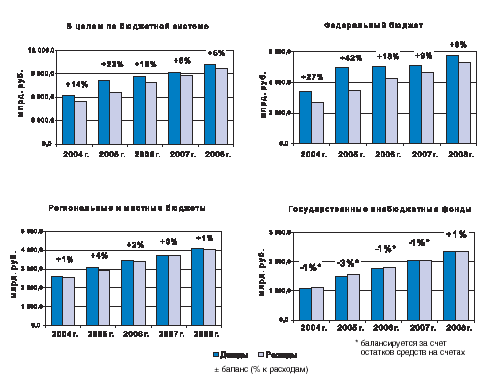 В 2006–2008 годах бюджетные расходы будут полностью обеспечены доходами как в целом по бюджетной системе Российской Федерации, так и в отдельности, по бюджетам разных уровней (рис.1).
