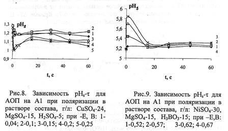 Исследования показали, что в процессе электрохимического окрашивания АОП в растворах минеральных солей в потенциостатическом режиме вместе с плотностью тока меняется pHs приэлектродного слоя (рис. 8-10). Величина рН исходного раствора CuS04 - 24 г/л, MgS04 - 15 г/л, H2S04-5 г/л составляет 1,26. В момент включения поляризующего тока при всех потенциалах окрашивания происходит подкисление приэлектродного слоя: pHs=l,18-l,03. С течением времени pHs увеличивается до 1,09-1,21. В исследованном диапазоне потенциалов возможно полное или частичное восстановление катионов меди. Зафиксированное подкисление приэлектродного слоя можно объяснить протеканием реакции: представлена зависимость рН5-т для АОП на алюминии в растворе состава, г/л: NiS04 - 30, MgS04 - 15, Н3В03-15 (рН=5,2). При включении поляризующего тока, вследствие протекания процесса разряда протоносодержащих частиц, наблюдается рост pHs до 5,4-5,8; затем рН, уменьшается и начиная с 15 с устанавливается в пределах 5,24-5,32, близких к рН в объеме раствора. Смещение потенциала в отрицательную сторону до - 2,32... - 2,52 В приводит к еще большему (до 5,5-5,9) подщелачиванию приэлектродного слоя в момент включения поляризации. Однако, через - 15 с pHs достигает исходных значений 5,2...5,3. Обнаруженный эффект может быть связан с ускорением процесса разряда ионов водорода. Более сложная картина наблюдается в растворах КМп04 (рис.10), когда pHs в объеме раствора составляет 1,15. В момент включения тока pHs достигает при Ек=1.22...1,12 В значений ~1,3±0,05. В первые 15 с происходит снижение pHs до 0,2 и в дальнейшем сильно зависит от потенциала, но со временем кривые рН8-т сближаются и стремятся к исходному значению рН в объеме.