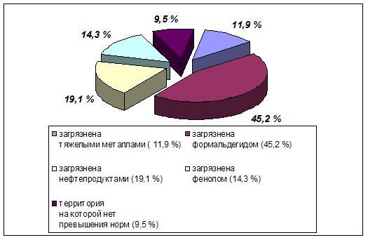 Превышения ПДК по загрязняющим веществам: тяжелым металлам, фенолам, формальдегиду, нефтепродуктам, водорастворимым фторидам, были выявлены на некоторых объектах города. Характер загрязнения почв города вредными ингредиентами представлен в диаграмме на рис. 1.